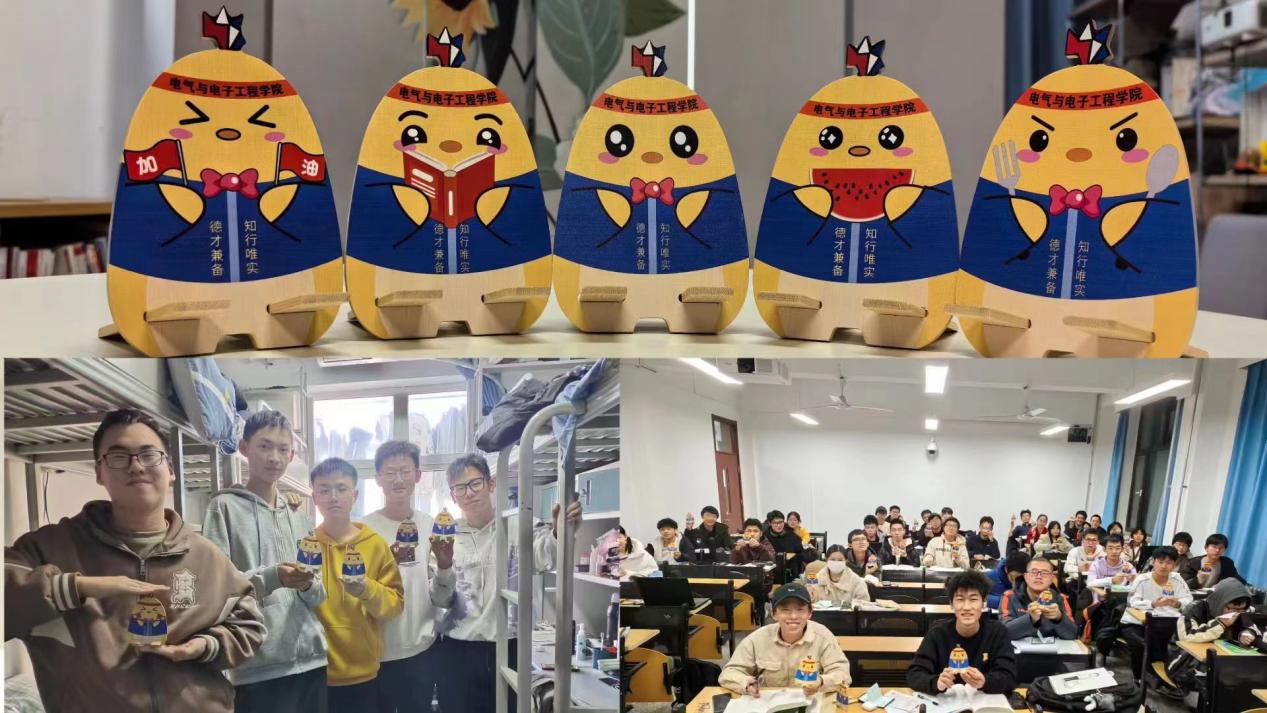 二级心理辅导站知心工作室自主设计的心理文创作品。手机支架特别设计了“吃瓜鸡”“读书鸡”“可爱鸡”“博学鸡”“干饭鸡”五种款式,无论是在图书馆、教室还是宿舍,小电鸡都能伴随师生左右。