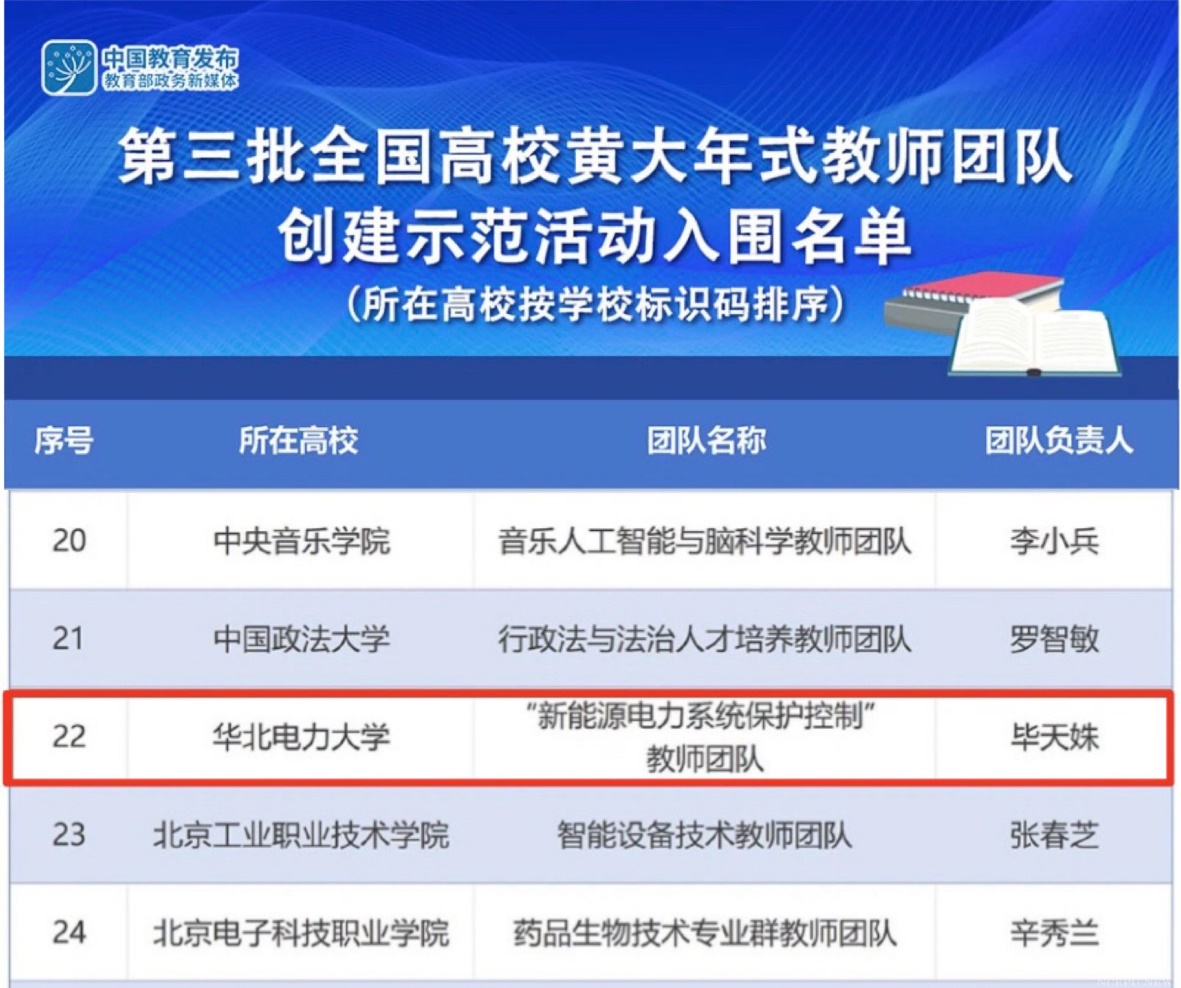近日,教育部发布关于第三批“全国高校黄大年式教师团队”创建示范活动入围名单,我校毕天姝教授带领的新能源电力系统保护控制团队成功入选。这是我校继能源动力与机械工程轻小说