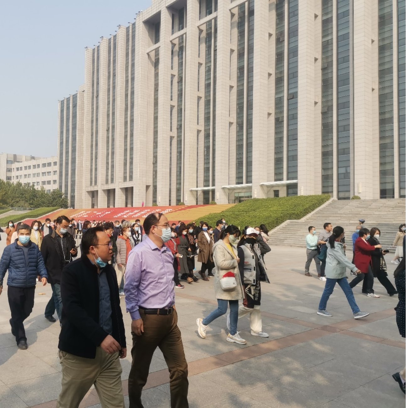 活动于中午12:30准时开始,老师们从主楼西广场出发,徒步环绕学校。日入深秋天意转冷,但午间的阳光又带来温暖,沿途落叶飘扬,景色令人心旷神怡。长走过程中老师们意气风发,相伴而行,讨论国家的新发展、学校的新进步。在走过操场的时候,老师们非常欣喜的交流着操场改造为体育中心这一学校大事,老师们说到,为校园带来一方活力的旧操场将迎来它的全新改造,我们也在党的带领下走进新的征程,将以全新的精神面貌投入到工作中。