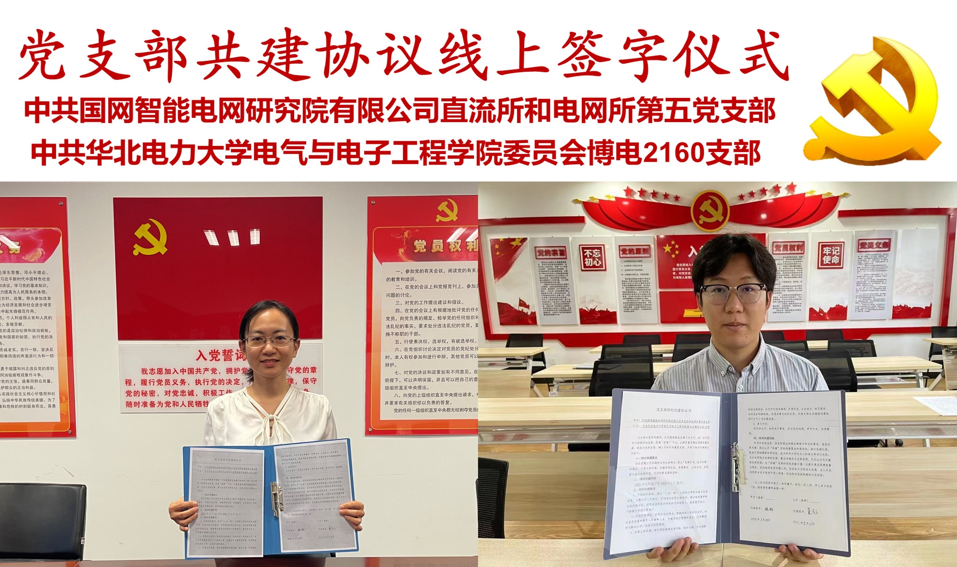 会议伊始,智研院直流所和电网所第五党支部书记林畅就支部党建情况和科研开展方面做了介绍。博电2160班党支部书记董浩云介绍了支部基本情况、成员研究方向以及党建活动等。两个支部都成立不到一年,且支部成员研究方向都围绕“双碳目标“发展战略,有活力,有共鸣。通过两位支部书记的介绍,双方支部成员相互了解,为后续共建活动的开展奠定基础。会前经共建双方多次对接探讨、深入交流,制定了《结对共建协议书》,从共建指导思想、要求、目标开展了详细的规划。双方党支部计划通过多种党建活动相互交流,加大党员发展和人才培养力度,共促队伍建设;相互帮助理清思路,共创新格局;借助支部共建,明确“双碳”目标的重要性和紧迫性;通过党建引领,就电气领域最新科研动态和技术难点进行交流,充分发挥校企共建的优势,整合双方资源,为实现“双碳”目标贡献力量,形成校企党组织联建的经验。