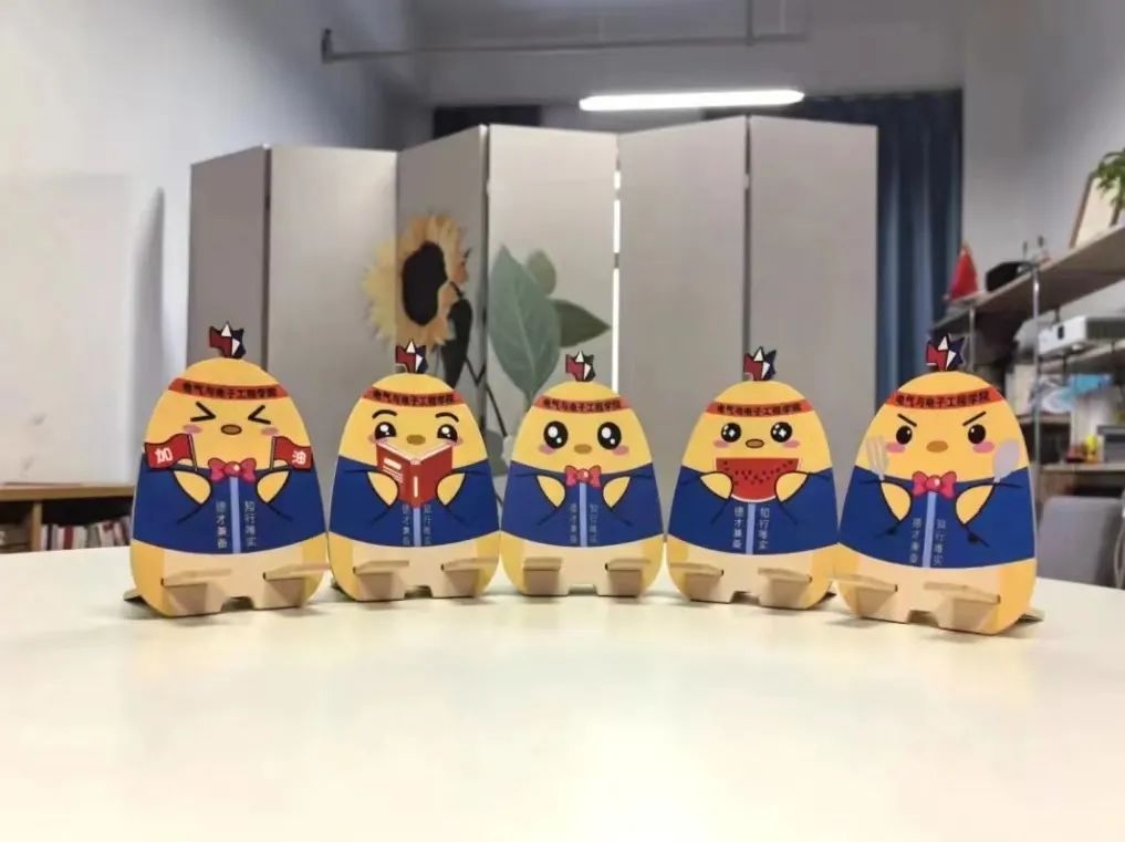 手机支架正面印制有“电气与电子工程学院”“德才兼备、知行唯实”的字样,这不仅是对学院精神的传承,也是对师生们的⼀种鞭策和鼓励。通过这种方式,希望师生们能够时刻铭记学院的教育理念,努力成为堪当民族复兴大任的时代新人。⽀架背面印制有心理咨询室地址方式等详细信息,这是对师生们心理健康的⼀种关怀和提醒。在面对学习、生活压力时,希望⼤家能够及时寻求⼼理帮助,保持⾝心健康。小电鸡手机支架采用木质环保材料制作,既符合环保理念,也体现了学院对可持续发展的追求。我们希望能够引导师生们关注环境保护,共同为可持续发展贡献力量。支架特别定制了“吃瓜鸡”、“读书鸡”、“可爱鸡”、“博学鸡”和“干饭鸡”五种款式,让大家的手机支架充满个性!无论是在图书馆、教室还是宿舍,小电鸡都能为大家提供方便。希望它可以守护大家的健康心态,陪伴大家度过每一个快乐时刻!