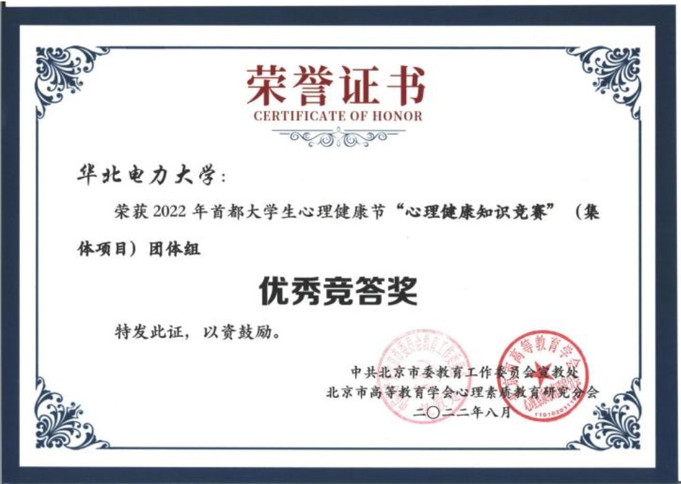 与此同时,电院学子在心理健康知识竞赛中拼搏进取、齐心协作、为校争光,以丰富的心理健康知识荣获2022年首都大学生心理健康节知识竞赛团体组优秀竞答奖。
