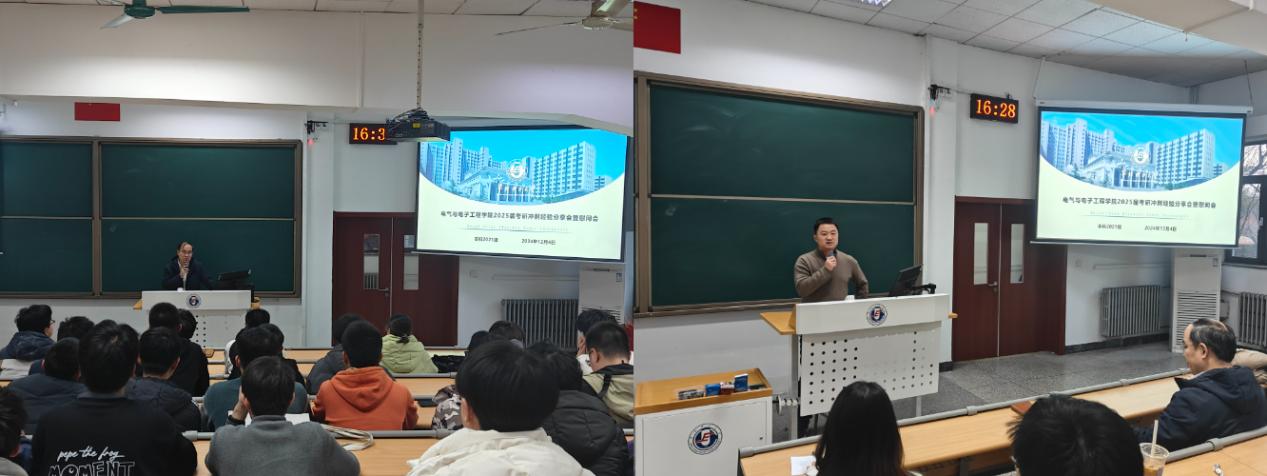 在考研冲刺的关键阶段,为缓解电院学子紧张焦虑的情绪,助力学生及时调整心态,树立坚定信心,电气与电子工程学院于12月4日在教一06阶梯教室成功举办2025届考研冲刺经验分享会暨慰问会。学院副院长齐磊(主持工作)、学院党委副书记王栋梁、本科2021级辅导员张欣烨、孙伟,研究生优秀学生代表以及考研学生代表参与此次会议。