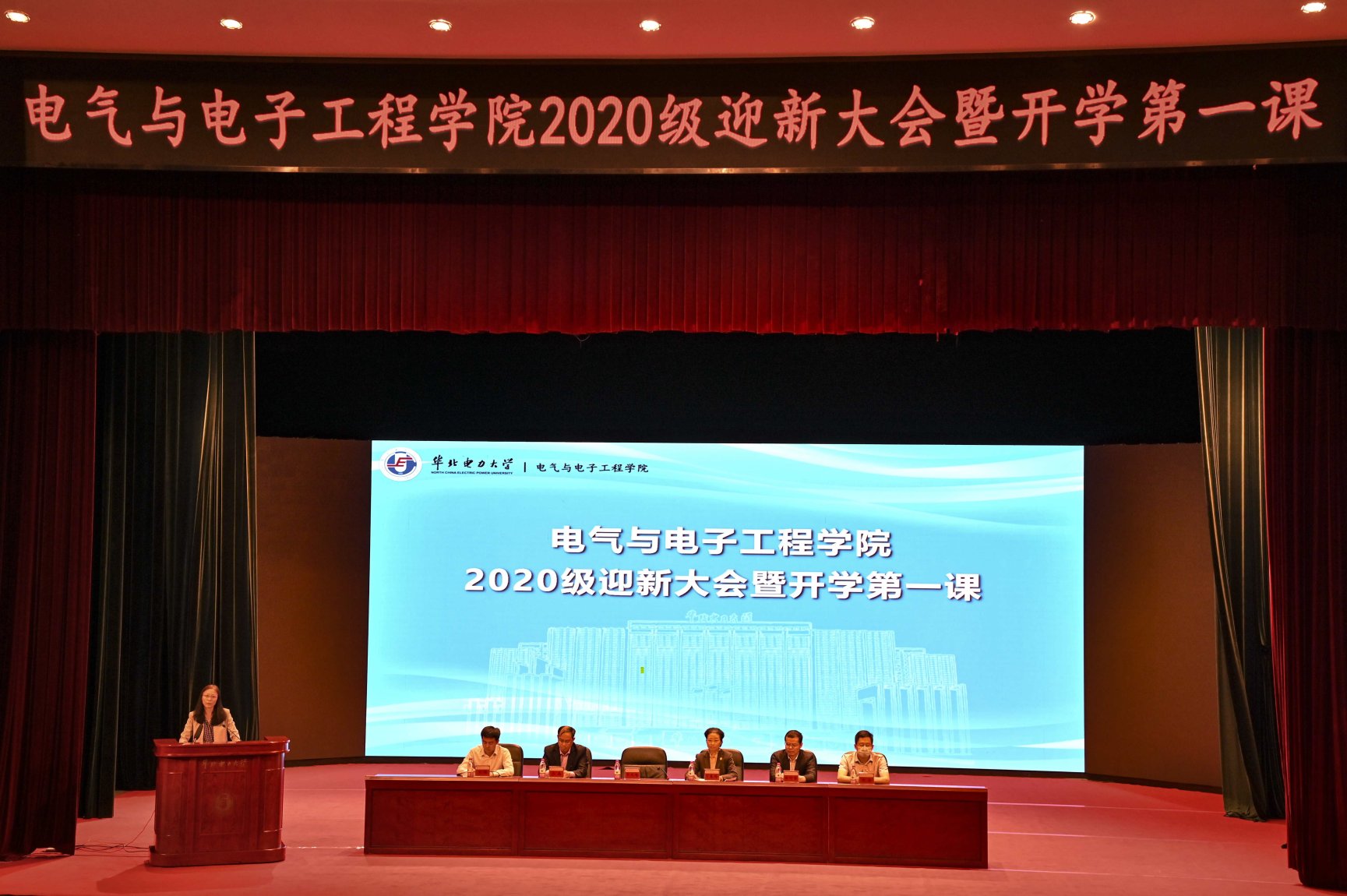 9月25日下午,电气与电子工程学院2020级迎新大会暨“开学第一课”在主楼礼堂隆重举行。大学副校长、院长毕天姝,学院党委书记卜春梅,副院长齐磊、徐衍会、刘念出席会议,学院党委副书记王硕主持大会。大会设主楼礼堂主会场和线上分会场,全体辅导员老师和全体本科生、研究生新生参会。
