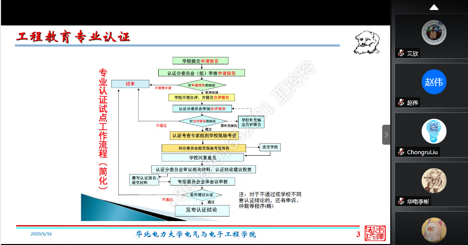 2020年6月16日20点至21点30分电气与电子工程学院通过腾讯会议召开了通信工程专业认证启动会,会议由电气学院主管本科教学副院长徐衍会主持。参加本次会议的人员包括,电子系主任戚银城,电子系副主任吕安强,教务处副处长杨世关、梁长屹,通信工程专业负责人赵雄文、孔英会,专业认证资深专家王泽忠、艾欣,以及主管学生工作的副书记、通信信息骨干教师等25人。
