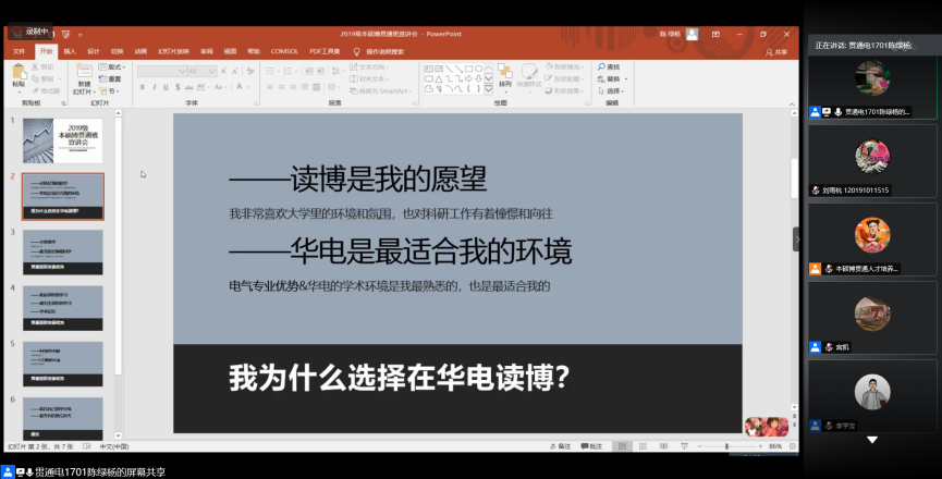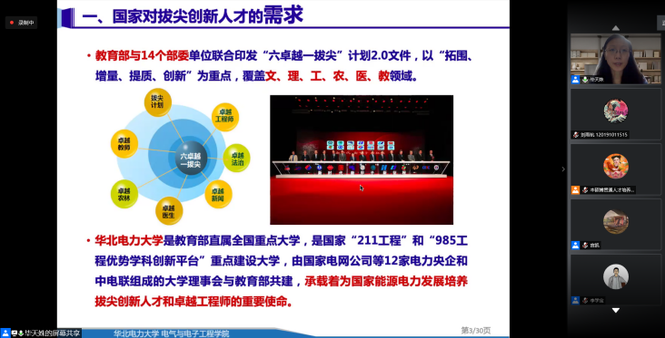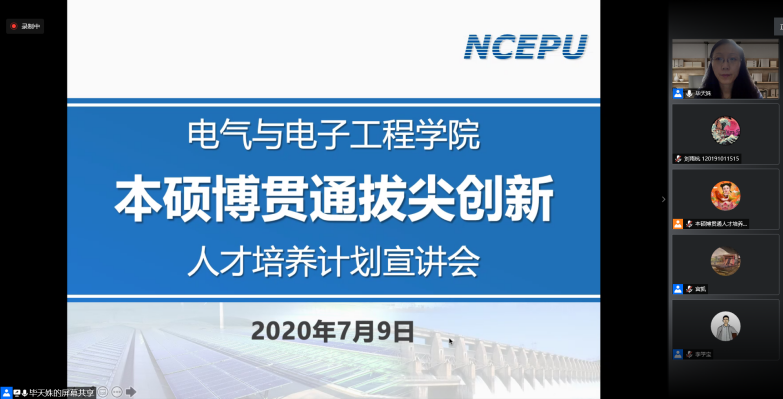 2020年7月9日晚,电气与电子工程学院召开本硕博贯通拔尖创新人才培养计划宣讲会,会议通过腾讯会议线上形式召开。大学副校长、电气学院院长毕天姝做主旨演讲,学院副院长齐磊和徐衍会、教师代表李学宝、学生代表陈绿杨参加会议,会议由宫凯主持。本次会议就贯通拔尖创新人才培养相关事宜向全校19级优秀学子进行介绍并答疑。