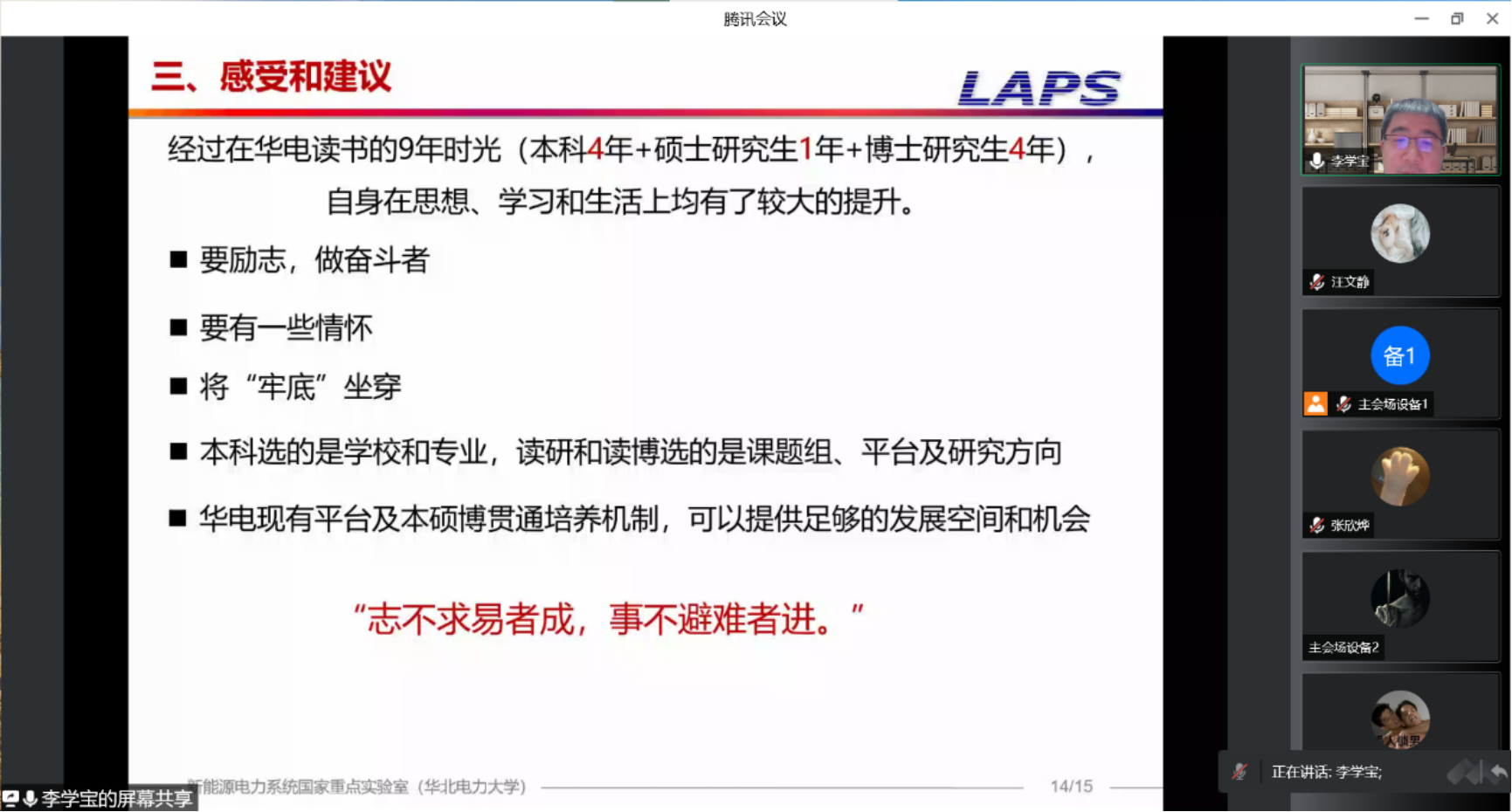 学院副教授李学宝作为首届实验班的受益者,将自己在华电九年的学业经历分成学习期、初探期、迷茫期、奋斗期四个阶段,向同学们介绍体会感悟。他提到,本硕博贯通培养不但能够激励自身积极进取,追求卓越,锤炼良好心态,而且是一个能为优秀的学生提供充足的发展空间和发展机会的平台。他鼓励同学们始终坚定不移的做一个励志者、奋斗者、情怀者,把握机会,借本硕博贯通培养之东风,明确规划,找准方向“将牢底坐穿”。
