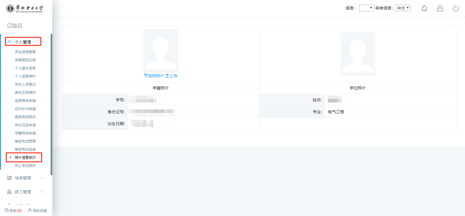 登录“新研究生管理信息系统(学生端)”, 在 “个人管理——照片信息核对”检查本人的学籍数码照片是否正确。如果发现没有自己的照片信息,请按照要求修改照片格式并上传。