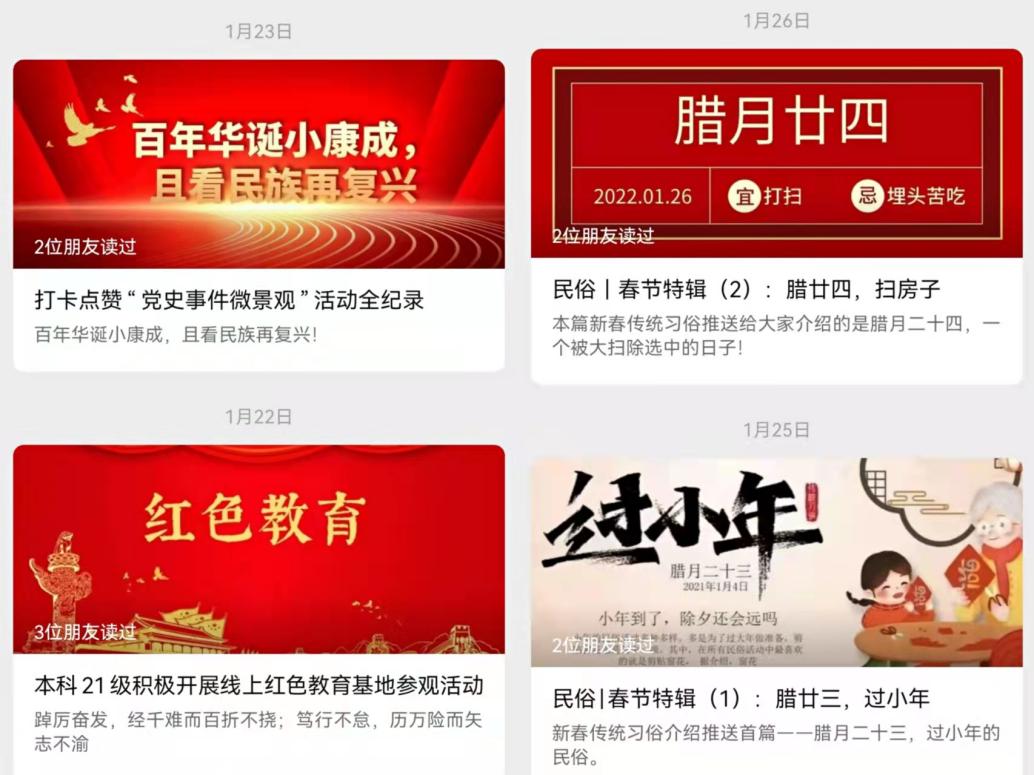 宣传教育,补足精神之钙。学习不止步,成长不延期,寒假期间的宣传教育同样不可缺席。1月29日,全国劳动模范、全国五一巾帼标兵冯艳校友,为近300名本硕博同学们开讲了“E友亦师”第一场微讲座“传承工匠精神,在新时代电网发展新征程中展现新作为”。学院团学推出“E起过寒假”系列推送,陪伴电院学子在假期里更加自律,进阶自我,团学不断追求原创,贴近平凡朴实的生活,努力实现与读者共鸣,共频,共振。本科2020级、本科2021级公众号发表寒假计划及生活分享推送,鼓励学生坚持学习,充实自我,度过一个丰富、有意义的假期。本科2021级公众号持续推出新春民俗文化介绍15期,带领同学们了解各地春节习俗,增强文化底蕴;同时,发表线上红色教育基地参观活动总结和微景观打卡活动总结,记录同学们的实践活动,以此鼓励学生持续树立“学党史,跟党走”的信念,肩负历史使命,坚定前进信心。