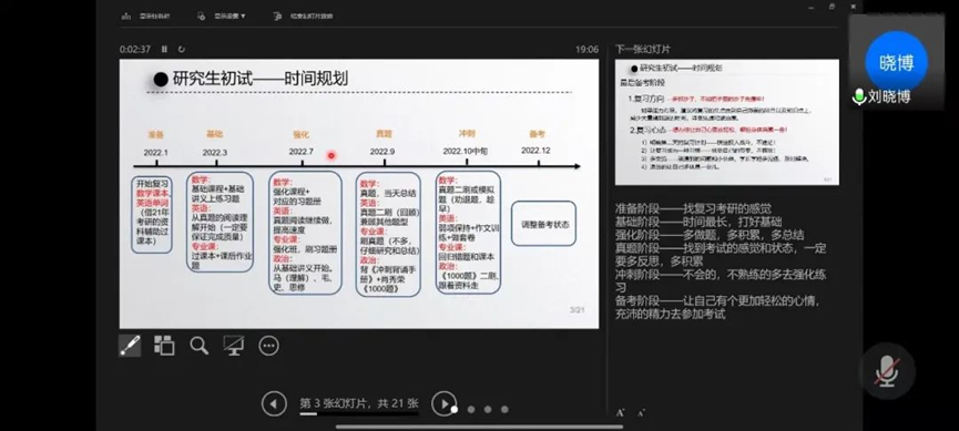 联动班主任,凝聚育人合力。为充分发挥班主任在学生教育中的重要作用,寒假刚放假,本科各年级就行动起来。本科2018级、本科2020级分别与班主任联动,沟通了学生的就业情况、学业进展。本科2021级针对本学期期末考试情况进行成绩分析,重点标记2门及以上不及格的学生,辅导员一对一同步给班主任,沟通班级学生在校表现情况。本科2019级班主任组织召开考研就业经验交流小班会,对同学们考研就业持续开展指导工作;寒假期间,累计开展班会21场,邀请嘉宾59人,嘉宾包括在读研究生、行业专家、创业校友等,同学们参会积极,达到了促进同学考研就业准备的目的。目前,各年级结合各自特点,正在积极筹备和开展新学期班主任工作交流会。