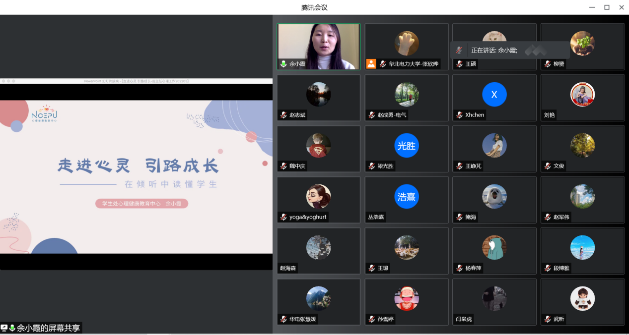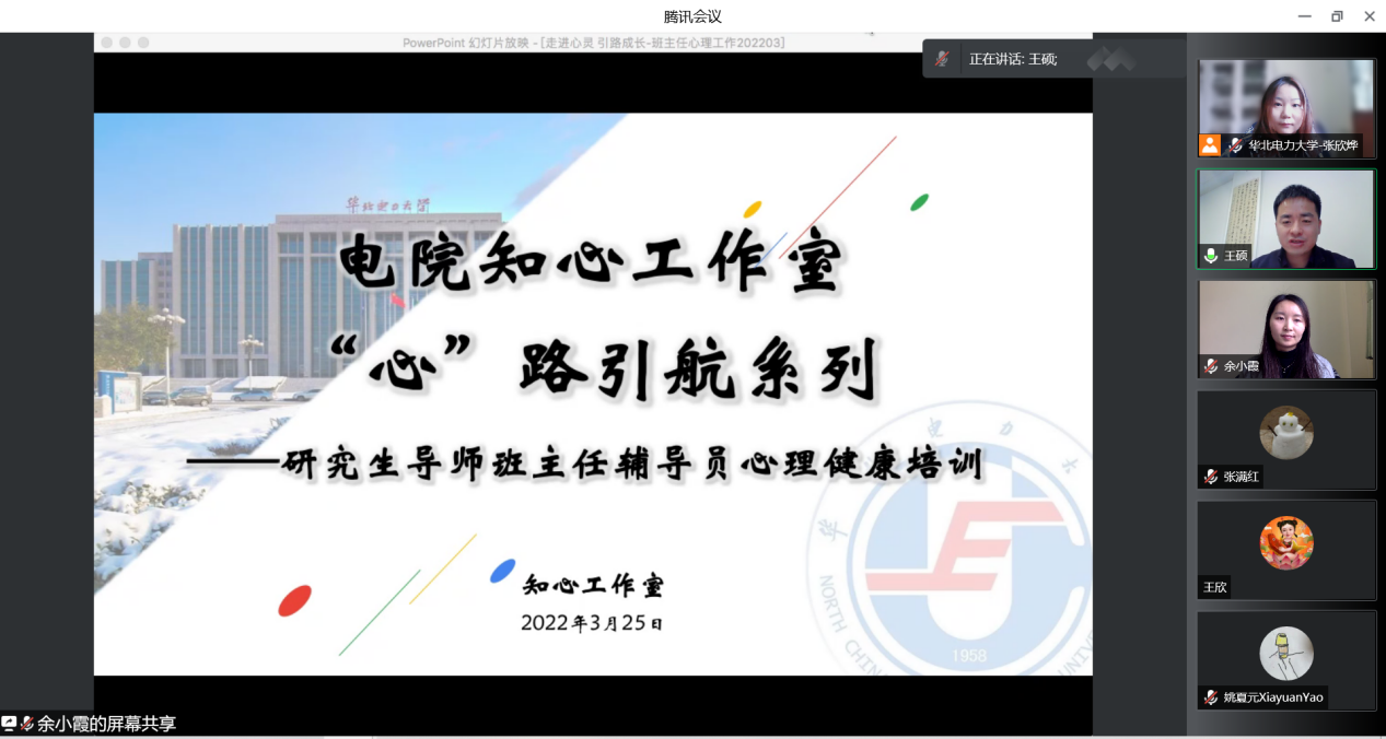 为积极促进大学生健康成长,努力增强研究生导师、班主任、辅导员心理育人工作能力,充分发挥二级心理辅导站作用,电气与电子工程学院由知心工作室组织,于3月21日、3月25日以线上的方式分批次召开心理健康教育工作培训会,特别邀请学校心理健康中心教师余小霞为大家带来了“走进心灵,引路成长——在倾听中读懂学生”为主题的培训。近百名研究生导师、班主任、辅导员参加了培训,全体兼职辅导员也参加了培训。培训由学院知心工作室负责辅导员张欣烨主持。
