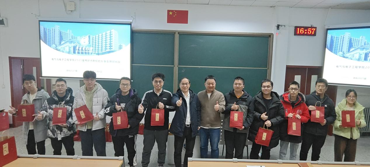 在考研冲刺的关键阶段,为缓解电院学子紧张焦虑的情绪,助力学生及时调整心态,树立坚定信心,电气与电子工程学院于12月4日在教一06阶梯教室成功举办2025届考研冲刺经验分享会暨慰问会。学院副院长齐磊(主持工作)、学院党委副书记王栋梁、本科2021级辅导员张欣烨、孙伟,研究生优秀学生代表以及考研学生代表参与此次会议。