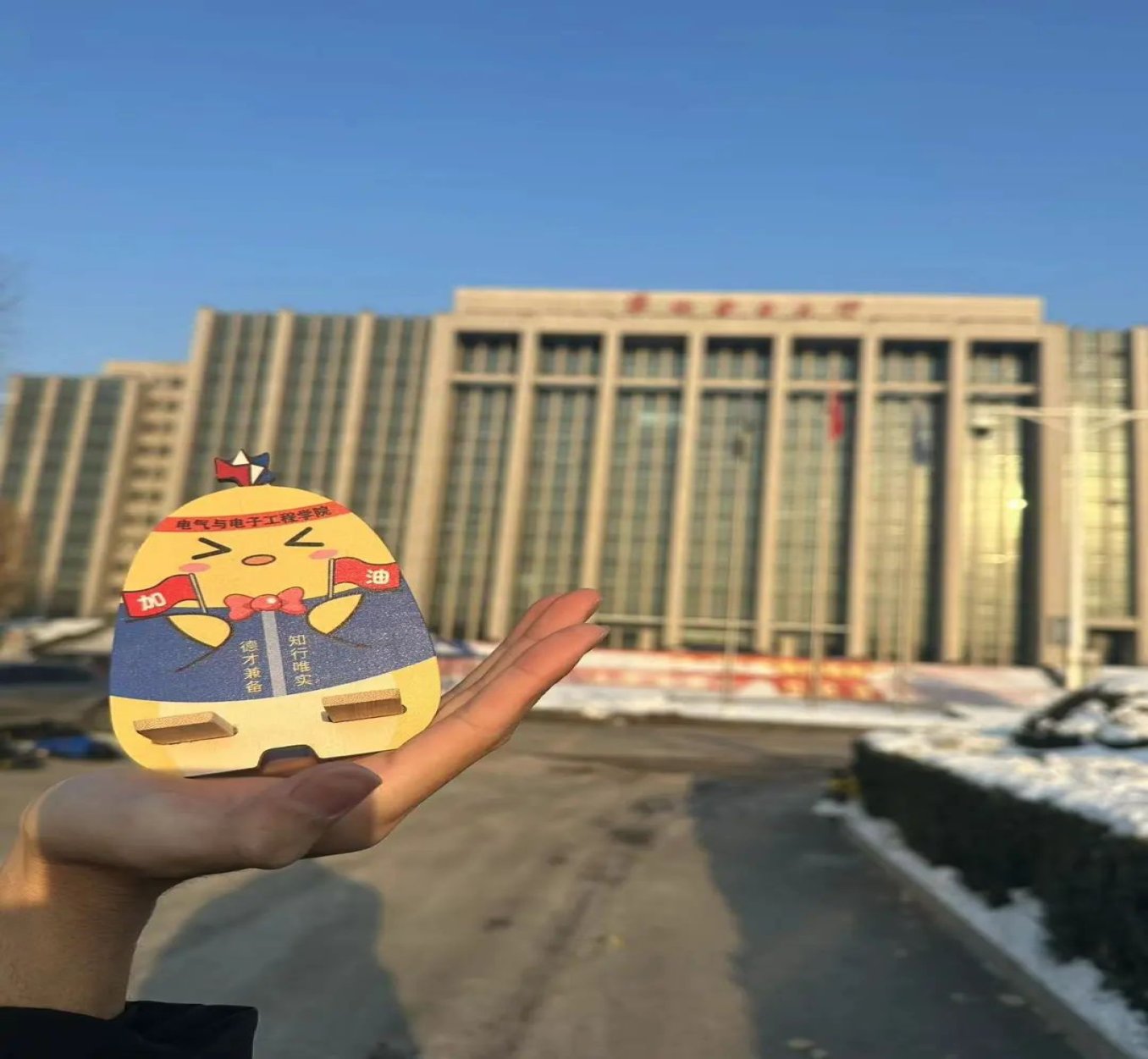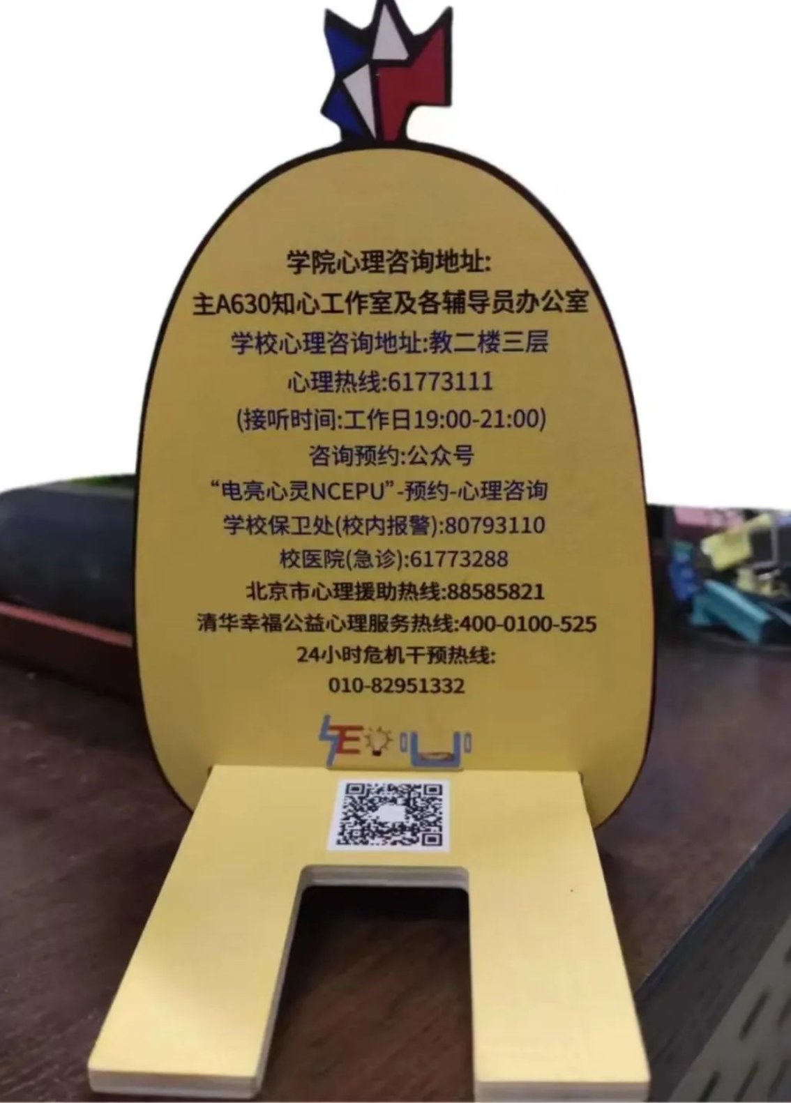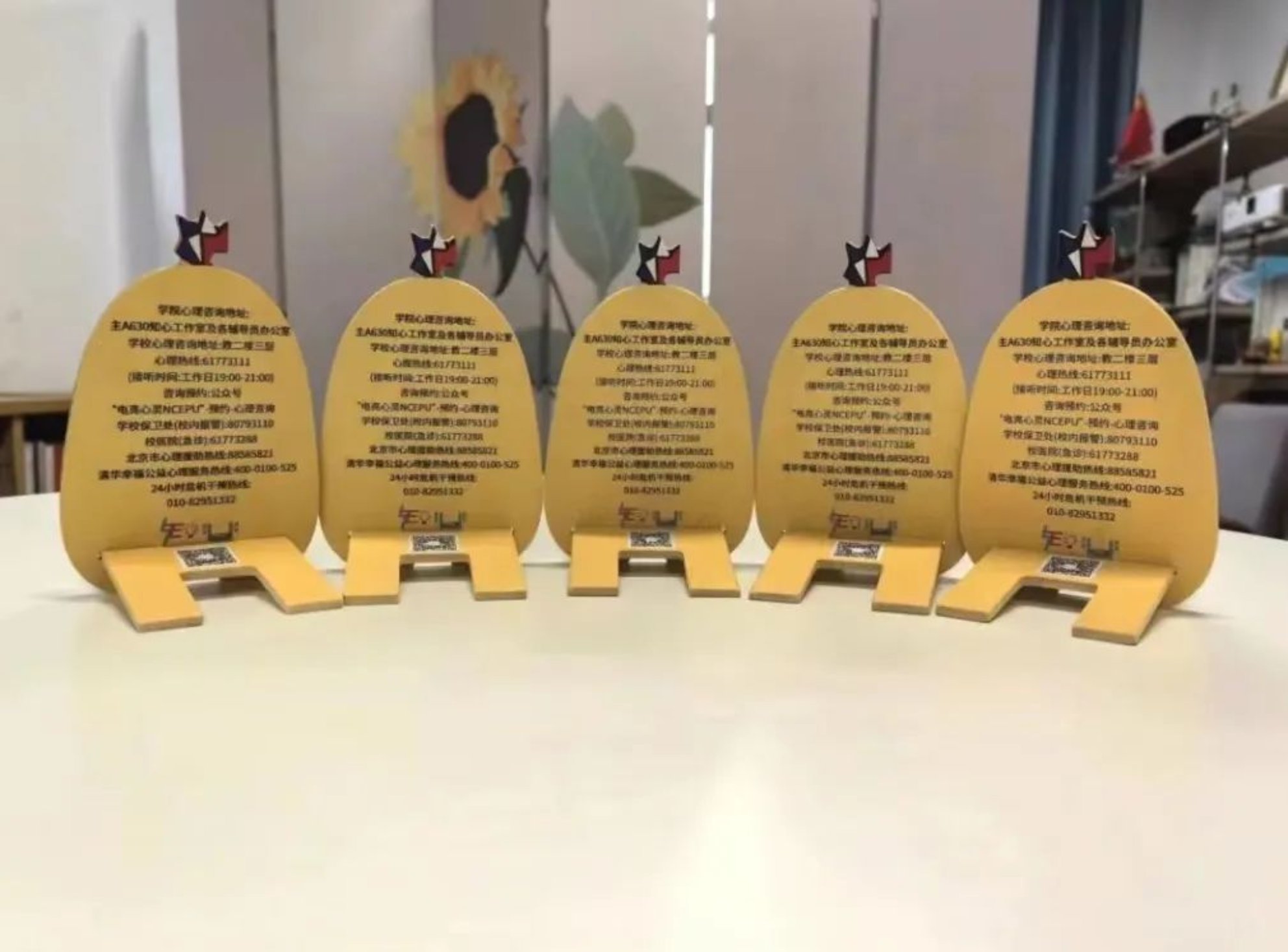 手机支架正面印制有“电气与电子工程学院”“德才兼备、知行唯实”的字样,这不仅是对学院精神的传承,也是对师生们的⼀种鞭策和鼓励。通过这种方式,希望师生们能够时刻铭记学院的教育理念,努力成为堪当民族复兴大任的时代新人。⽀架背面印制有心理咨询室地址方式等详细信息,这是对师生们心理健康的⼀种关怀和提醒。在面对学习、生活压力时,希望⼤家能够及时寻求⼼理帮助,保持⾝心健康。小电鸡手机支架采用木质环保材料制作,既符合环保理念,也体现了学院对可持续发展的追求。我们希望能够引导师生们关注环境保护,共同为可持续发展贡献力量。支架特别定制了“吃瓜鸡”、“读书鸡”、“可爱鸡”、“博学鸡”和“干饭鸡”五种款式,让大家的手机支架充满个性!无论是在图书馆、教室还是宿舍,小电鸡都能为大家提供方便。希望它可以守护大家的健康心态,陪伴大家度过每一个快乐时刻!