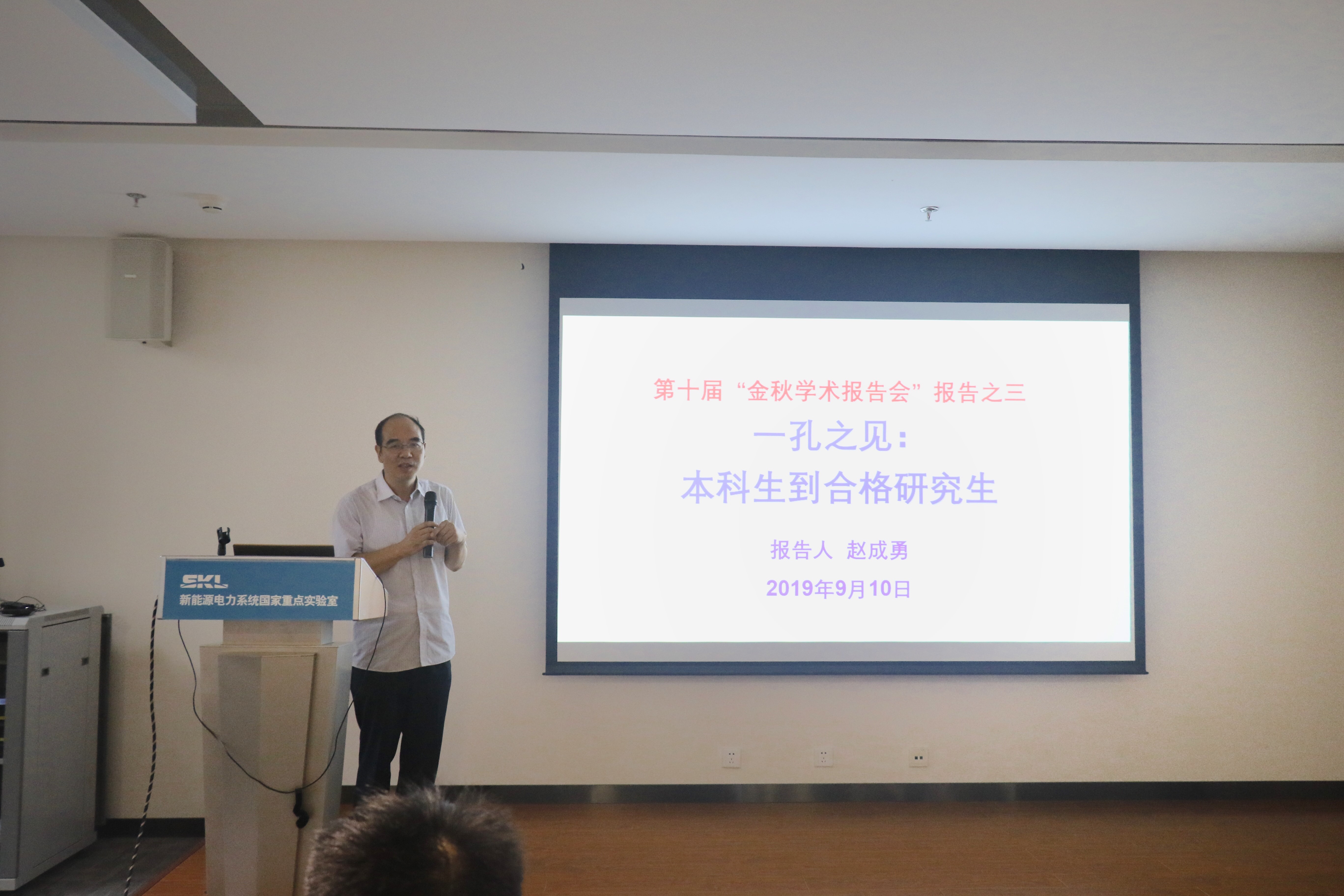 赵成勇教授报告的题目是“一孔之见:本科生到合格的研究生”,报告主要内容包括:研究生和本科生的不同;研究生的担当精神与责任;科研工作的体会以及华电梦的实现。赵老师谈到一名合格的研究生要有三个能力,适应、动手和创新能力,要有三个行动,勇于沟通、学术诚信和不能“逃避式”读研。赵老师的报告语言幽默风趣,富有启发意义,激起了在座师生们科研报国的热情。