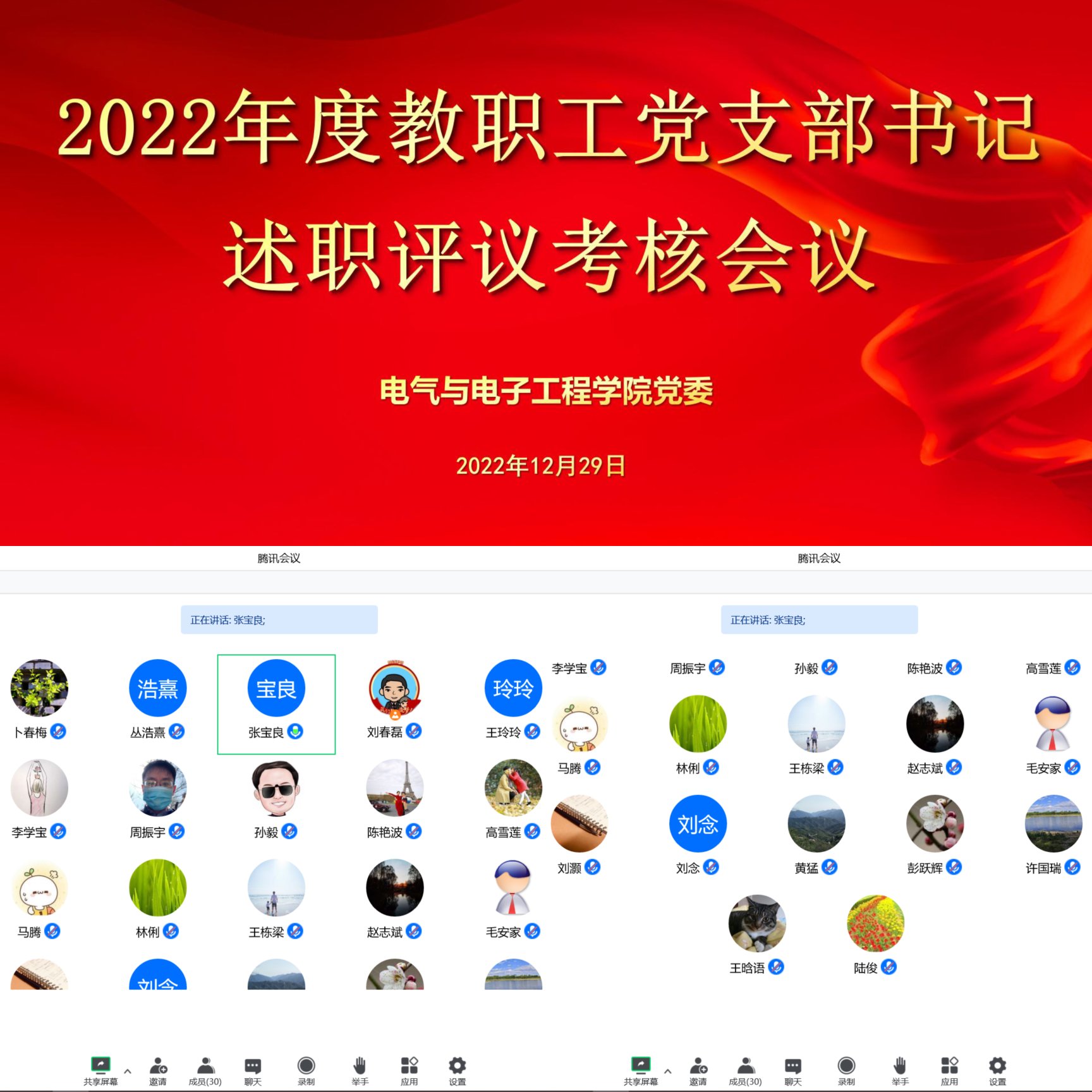为深入贯彻落实党的二十大精神,进一步巩固教育部党组巡视、校内巡察整改转化提升效果,根据学校《关于开展2022年度教职工党支部书记述职评议考核工作的通知》的有关要求,结合《电气与电子工程学院2022年度教职工党支部书记述职评议考核工作方案》的具体安排,12月29日电气与电子工程学院党委召开了教职工党支部书记述职评议考核会,学院党委书记卜春梅任组长、党委委员、领导班子成员、学院团委书记、分工会副主席、教师代表等学院全体考核小组成员出席会议并担任评委,会议由组织员张宝良处长主持。
