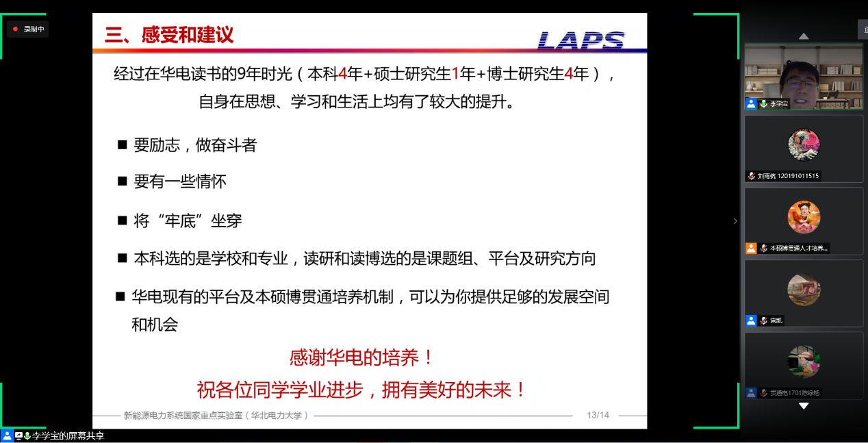 2020年7月9日晚,电气与电子工程学院召开本硕博贯通拔尖创新人才培养计划宣讲会,会议通过腾讯会议线上形式召开。大学副校长、电气学院院长毕天姝做主旨演讲,学院副院长齐磊和徐衍会、教师代表李学宝、学生代表陈绿杨参加会议,会议由宫凯主持。本次会议就贯通拔尖创新人才培养相关事宜向全校19级优秀学子进行介绍并答疑。