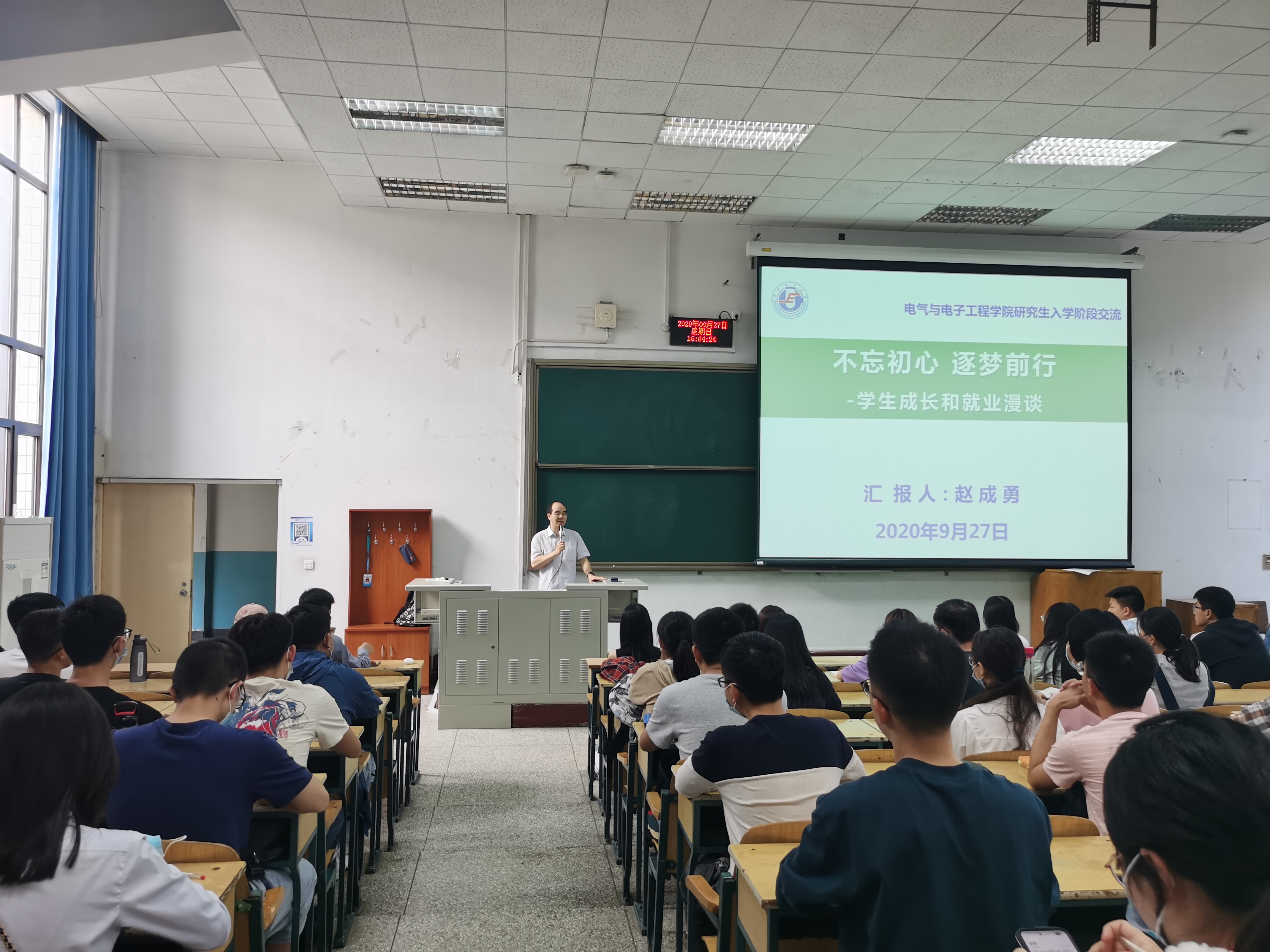 9月27日周日下午,为了更好的从一入学就对研究生新生的未来成长和就业发展做好积极的指引,电气与电子工程学院特别邀请新能源电网研究所所长赵成勇教授在教一楼14阶梯教室,为2020级200余名研究生新生作了“不忘初心逐梦前行——学生成长和就业漫谈”的专题讲座。学院党委副书记王硕主持了讲座,2020级硕士生辅导员赵川参加此次讲座。