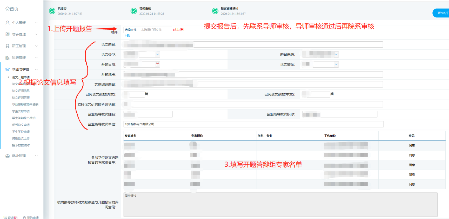 1、请按照下面的步骤操作。步骤1和2可以自行填写,步骤3和4必须填写,需联系导师在新系统中进行“审核”操作。