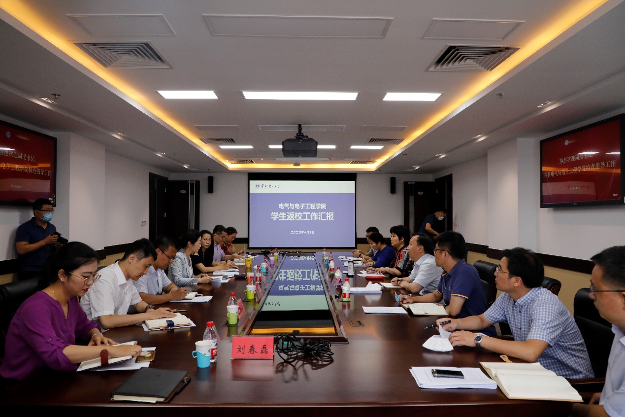 6月10日上午,校党委书记周坚到电气与电子工程学院调研指导学生返校准备工作,党政办公室、党委宣传部、党委学生工作部、科学与技术研究院负责同志参加调研。